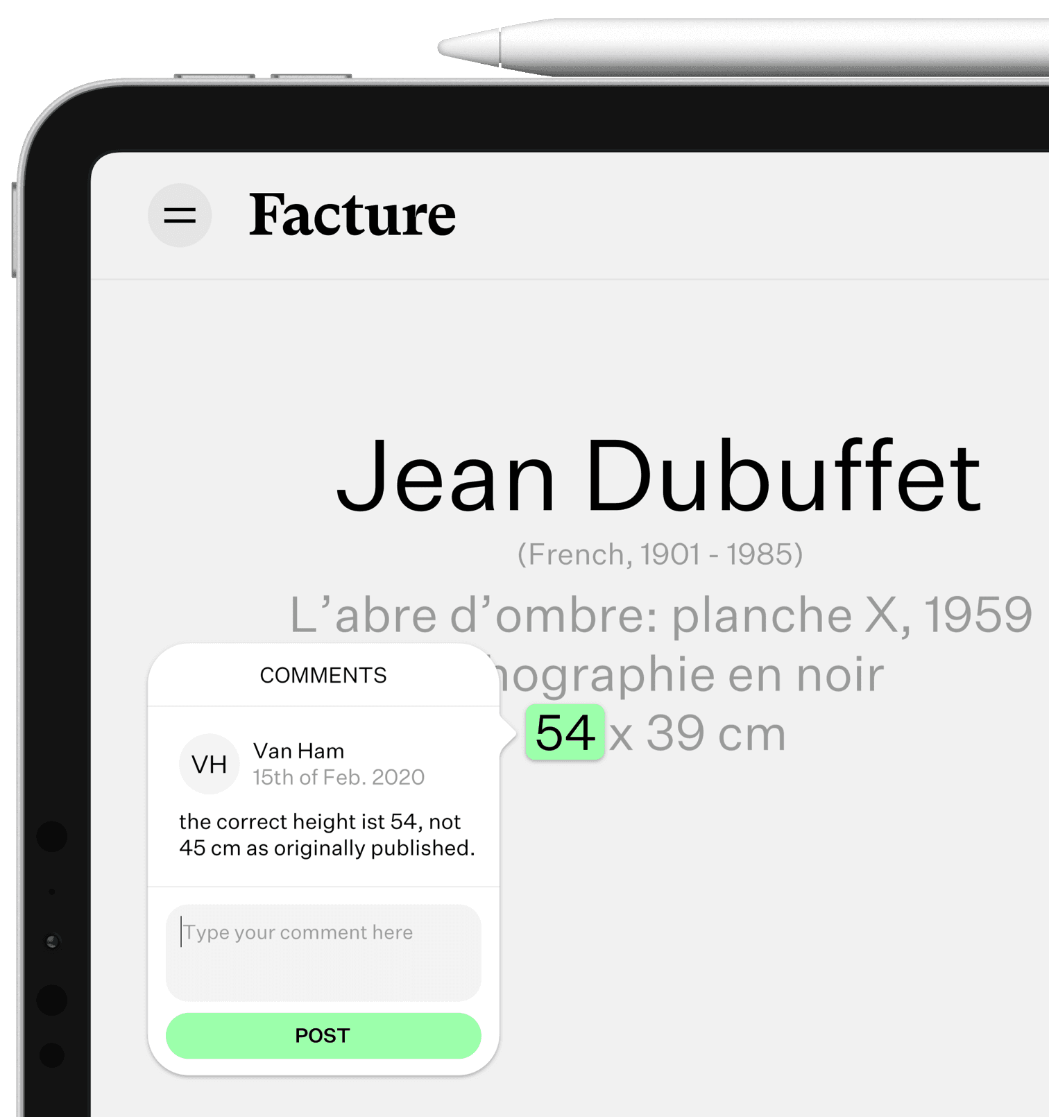 On Facture, you can interact with others and improve the accuracy of a specific catalogue raisonné entry, just by submitting a comment.