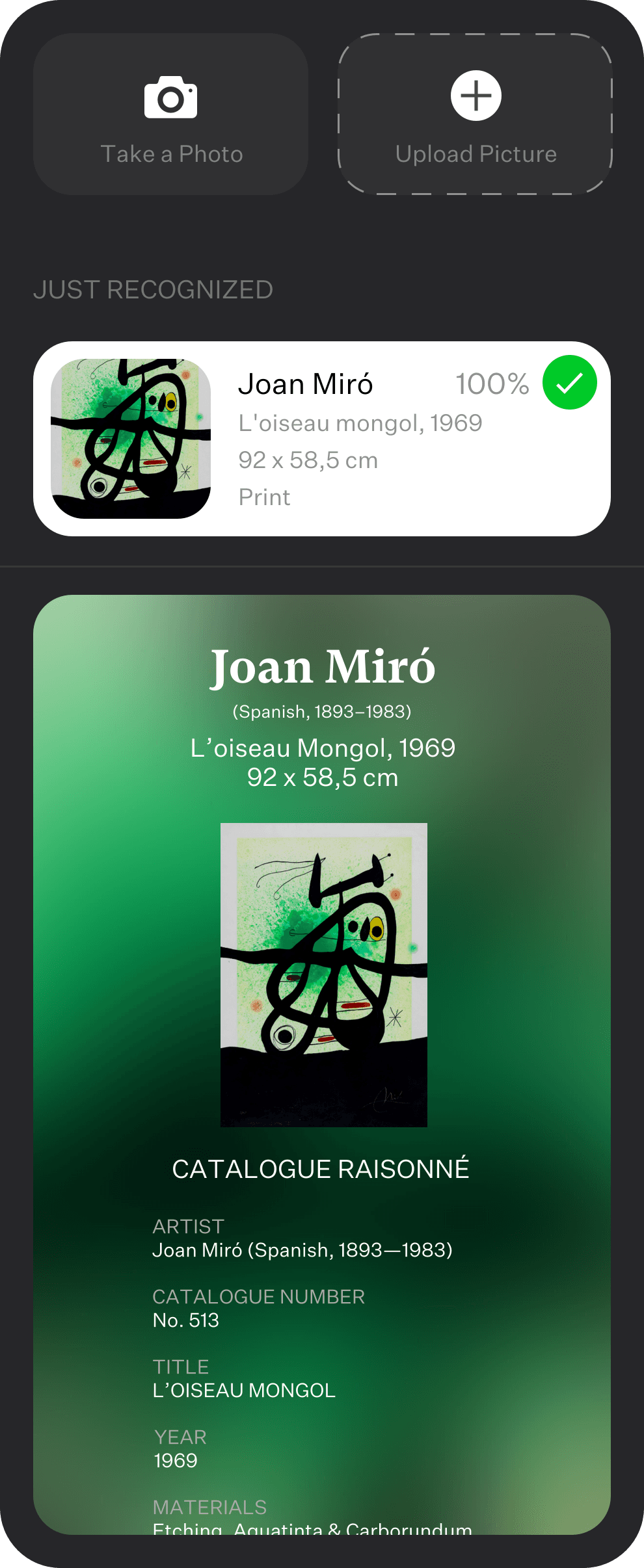 Search any artwork with an illustration of that work by taking a photo or uploading a JPEG to receive the artwork details within seconds.